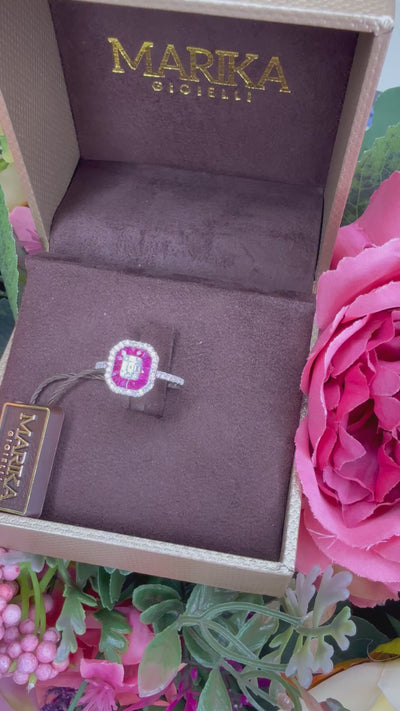 Il design di quest’anello in oro bianco 18 carati è pensato per valorizzare ogni dettaglio: al centro una composizione ottagonale formata da diamanti naturali taglio baguette e diamanti naturali taglio brillante, contornata da rubini naturali e da un giro di diamanti naturali taglio brillante, creando un effetto luminoso e raffinato. Inoltre il pavé sul gambo dona maggiore luminosità all’anello.