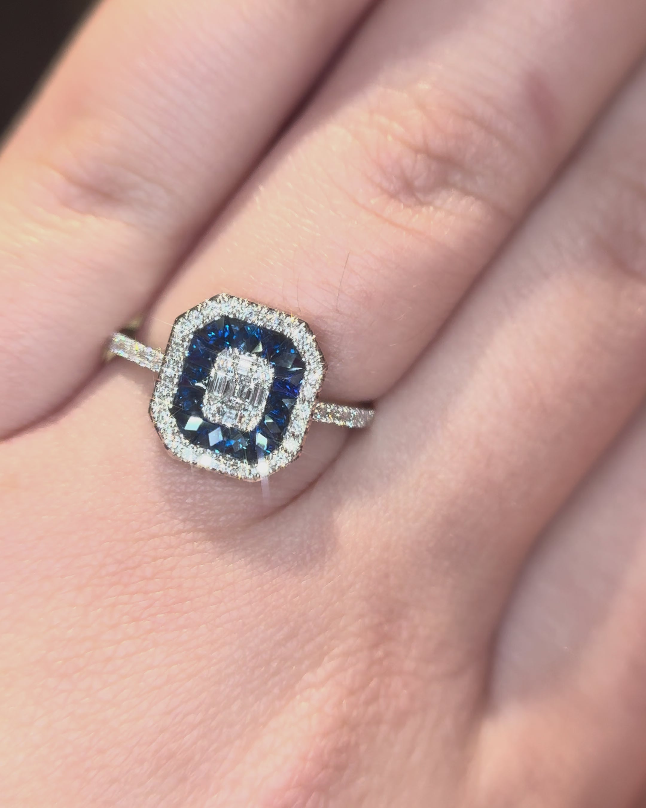 The design of this 18-karat white gold ring is designed to enhance every detail: at its center, an octagonal composition of baguette-cut and brilliant-cut diamonds, surrounded by natural sapphires and a ring of brilliant-cut diamonds, creates a luminous and refined effect. Furthermore, the pavé setting on the shank adds extra sparkle to the ring.