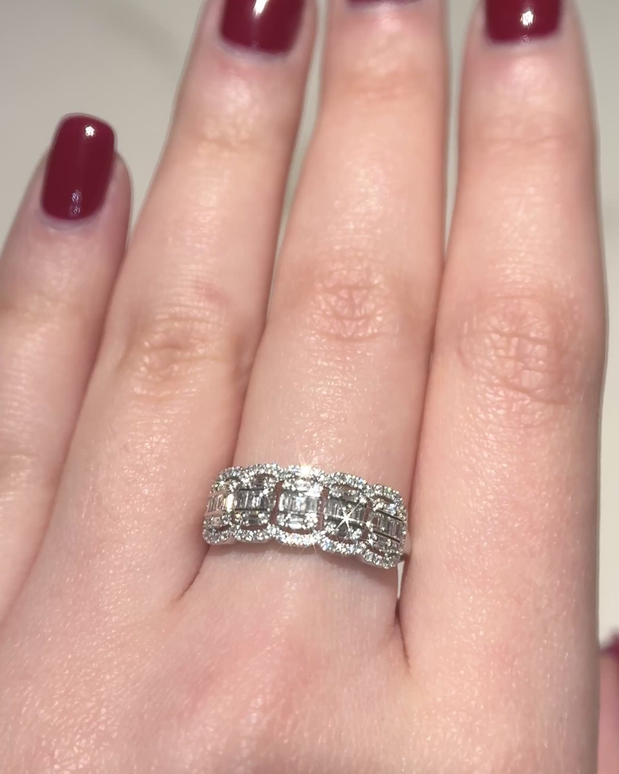This band's design is carefully crafted to enhance every detail: baguette-cut natural diamonds and brilliant-cut natural diamonds, combined together, create the optical illusion of five large central stones. The entire ring is surrounded by brilliant-cut natural diamonds that amplify its light and brilliance.