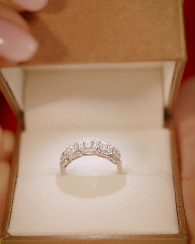 The design of this ring is studied to enhance every detail: a sequence of octagonal baguette-cut natural diamonds is surrounded by brilliant-cut natural diamonds, which amplify their light and brilliance.