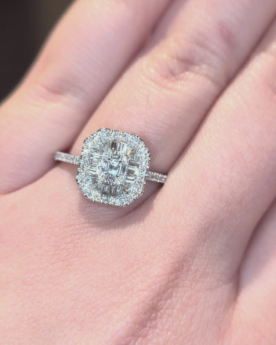 ANELLO OTTAGONALE IN ORO BIANCO 18KT DIAMANTI E BAGUETTE